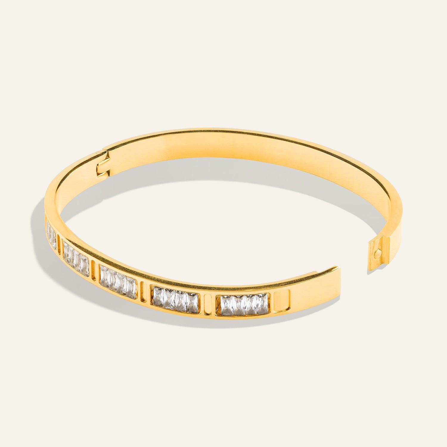 The Glint Bangle is designed to catch the light - and keep it. Featuring a precise row of intricately set baguette stones and a secure hinge closure, this piece blends sleek structure with eye-catching detail. A modern classic that adds just the right amount of shimmer to your stack or stands out beautifully on its own. Crafted with gold dipping over stainless steel with glass jewels.