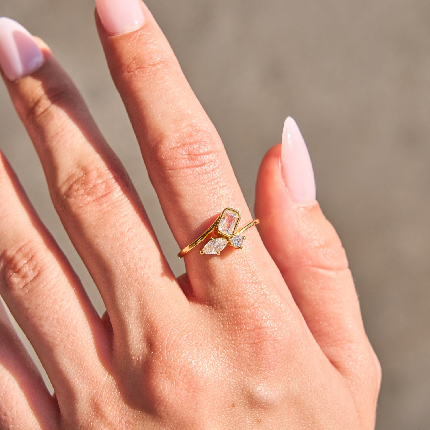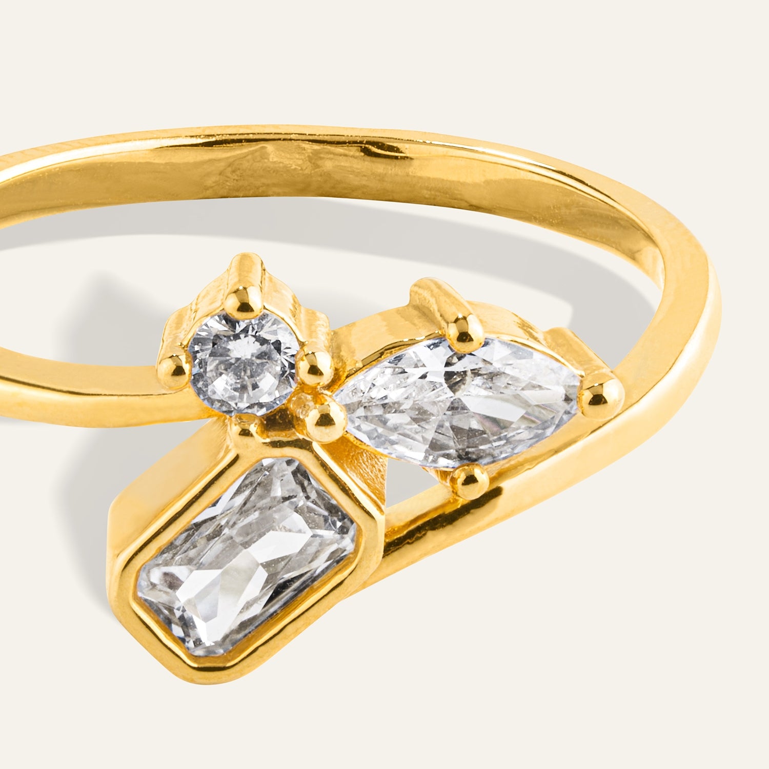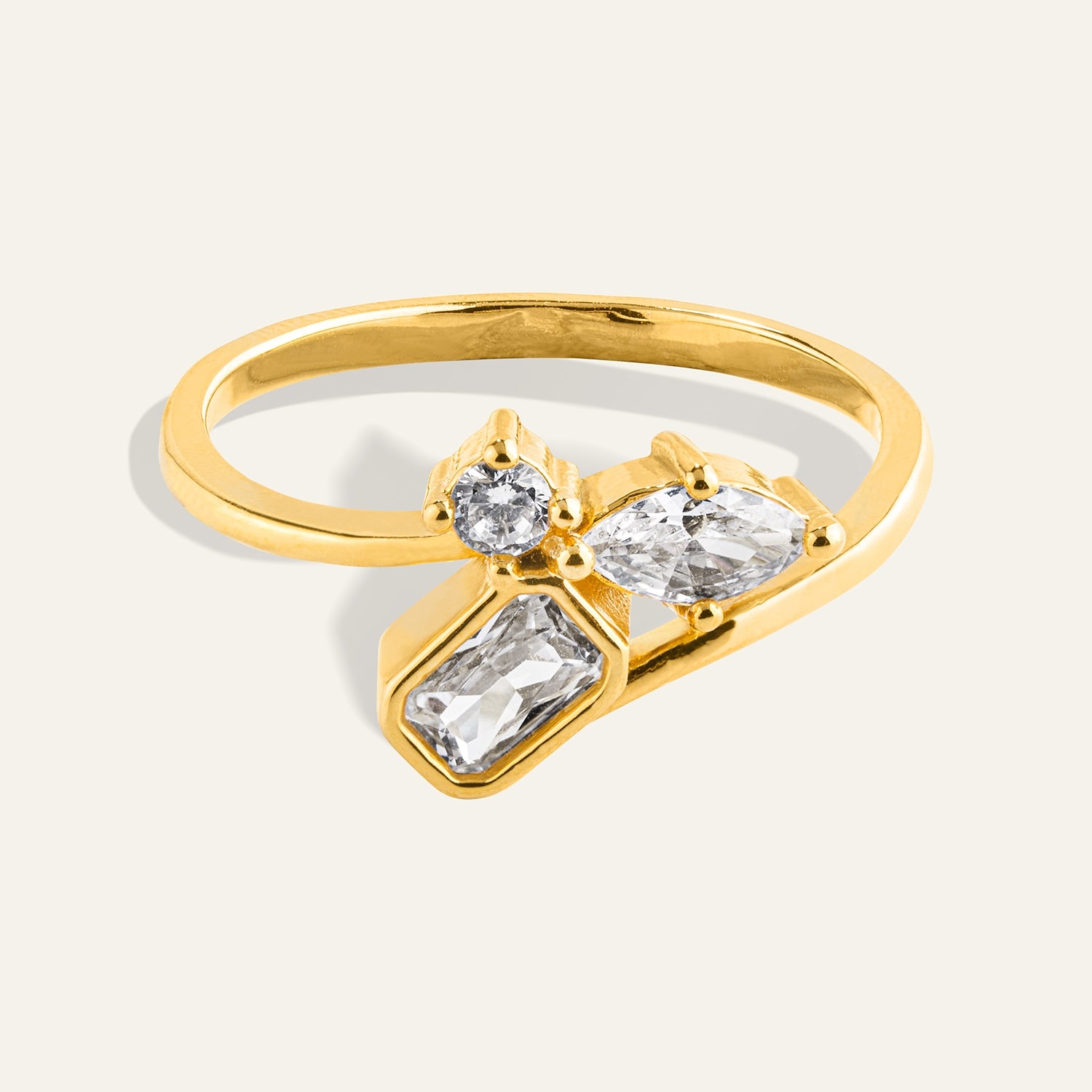 An artful blend of marquise, round, and square cubic zirconia stones set along a sleek band, the Fusion Ring celebrates individuality and modern elegance. Its dynamic design catches the light beautifully, making it a versatile statement piece for any occasion. Crafted with 18k gold dipping over brass with cubic zirconia.