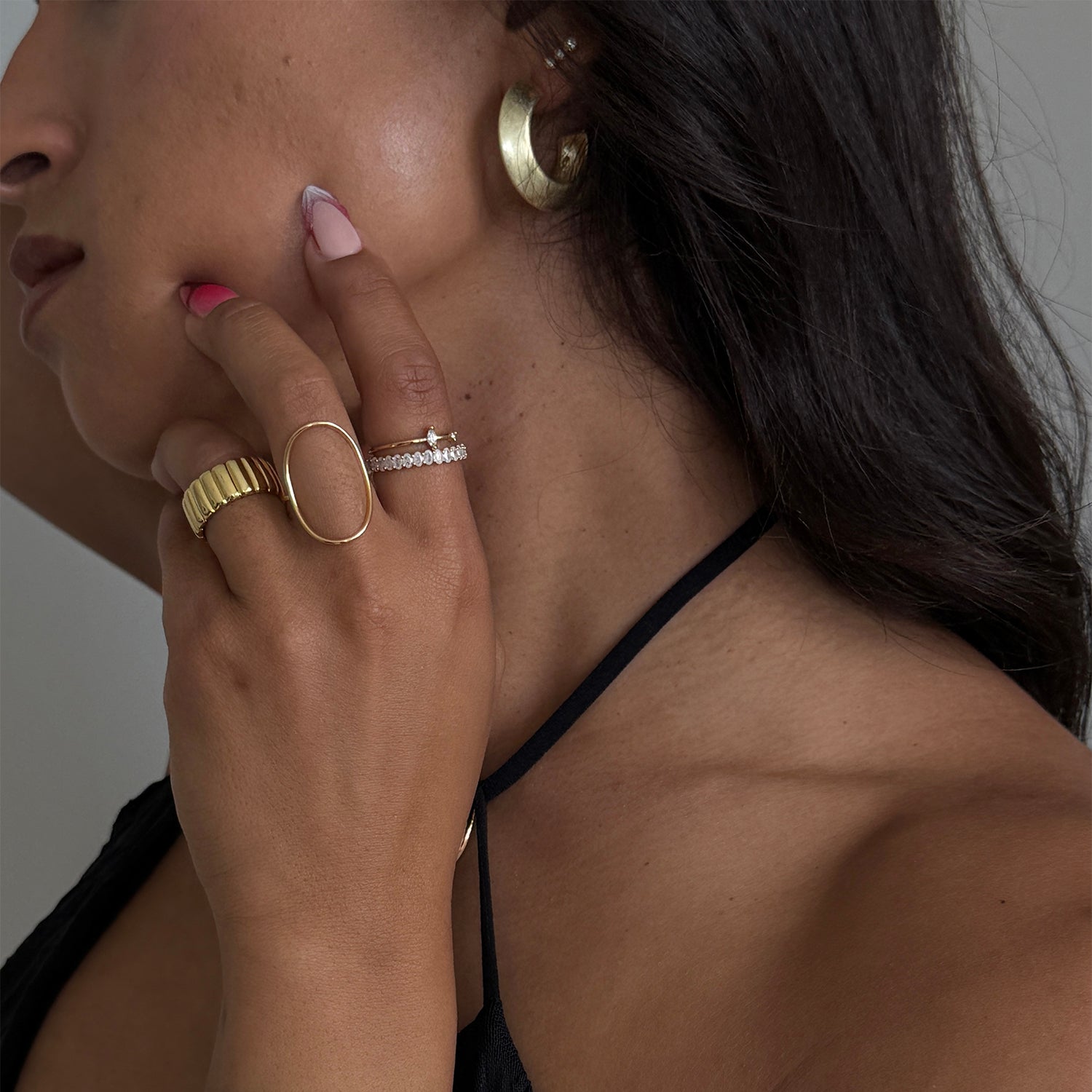 The ultimate finishing touch. The Delicate Stud Ring features a minimalist gold-plated band accented with tiny stud details — subtle yet striking. Whether you're dressing up or keeping it casual, this piece effortlessly completes any look. Crafted with gold plating over brass and cubic zirconia