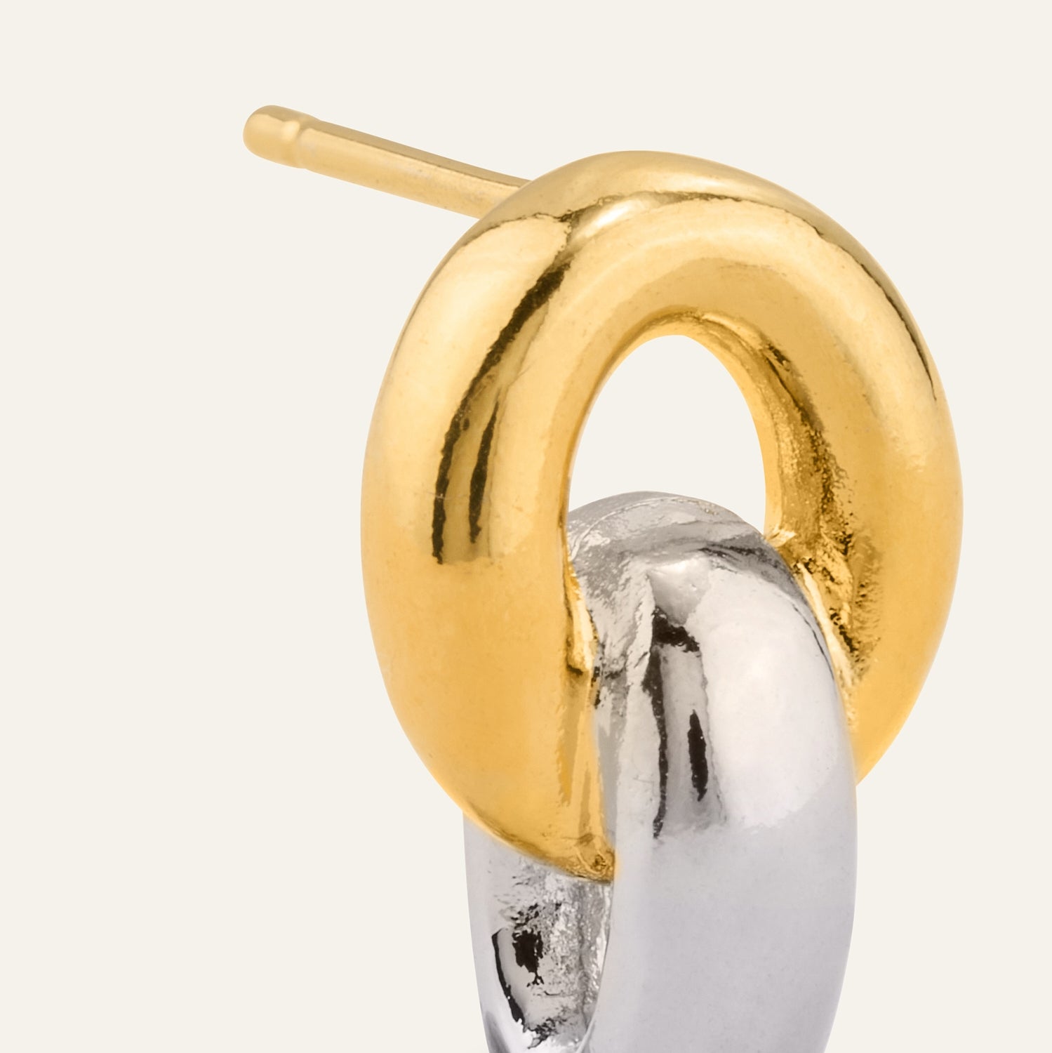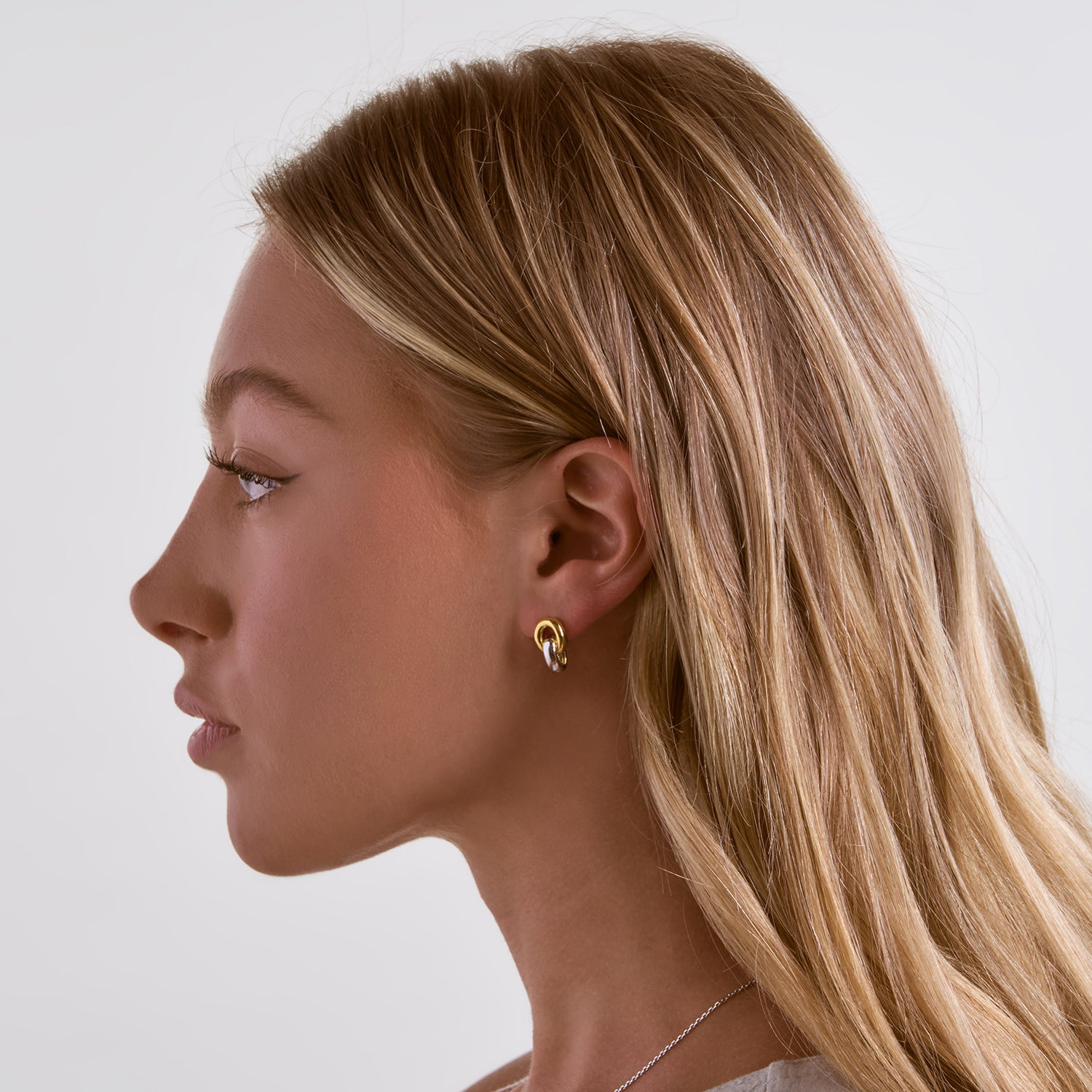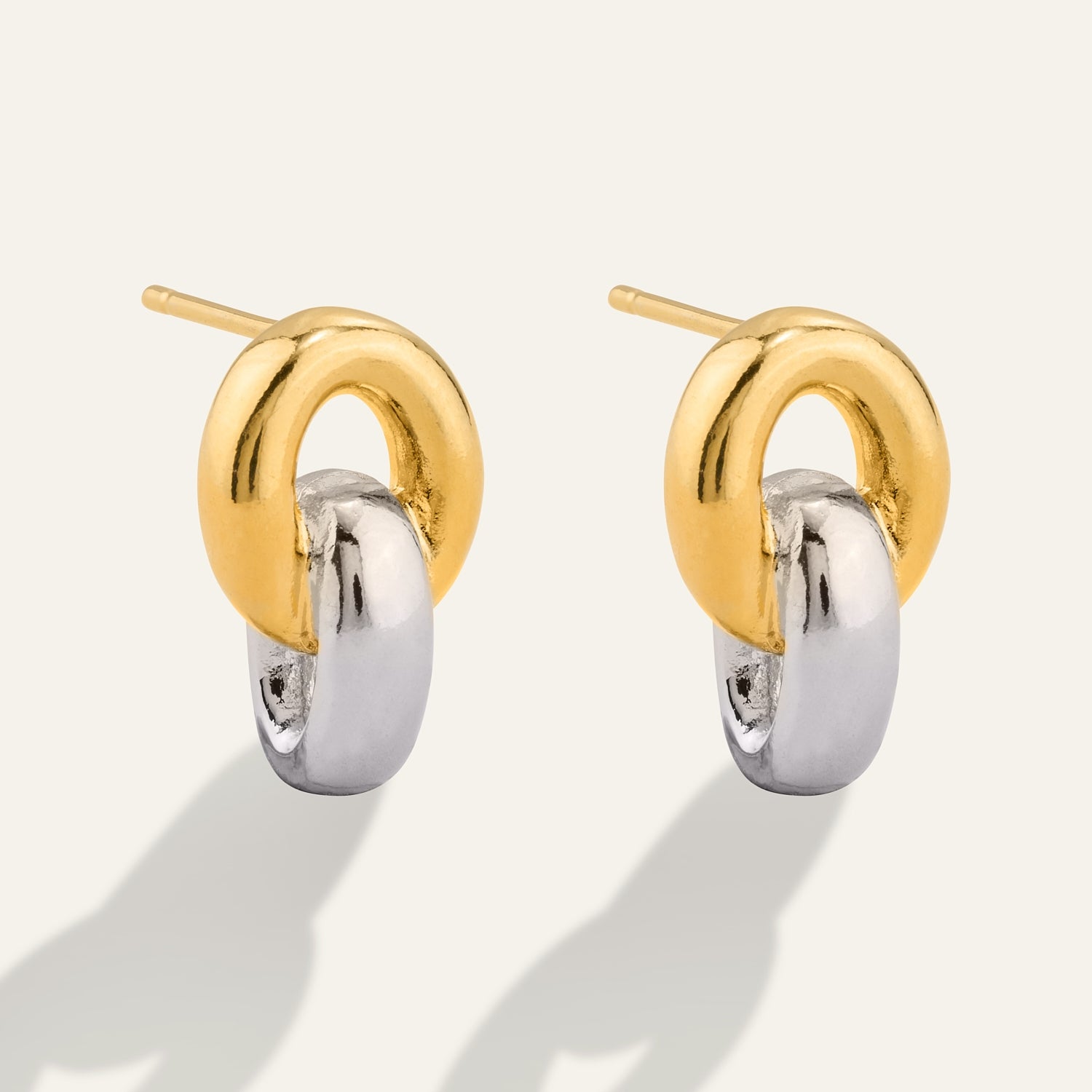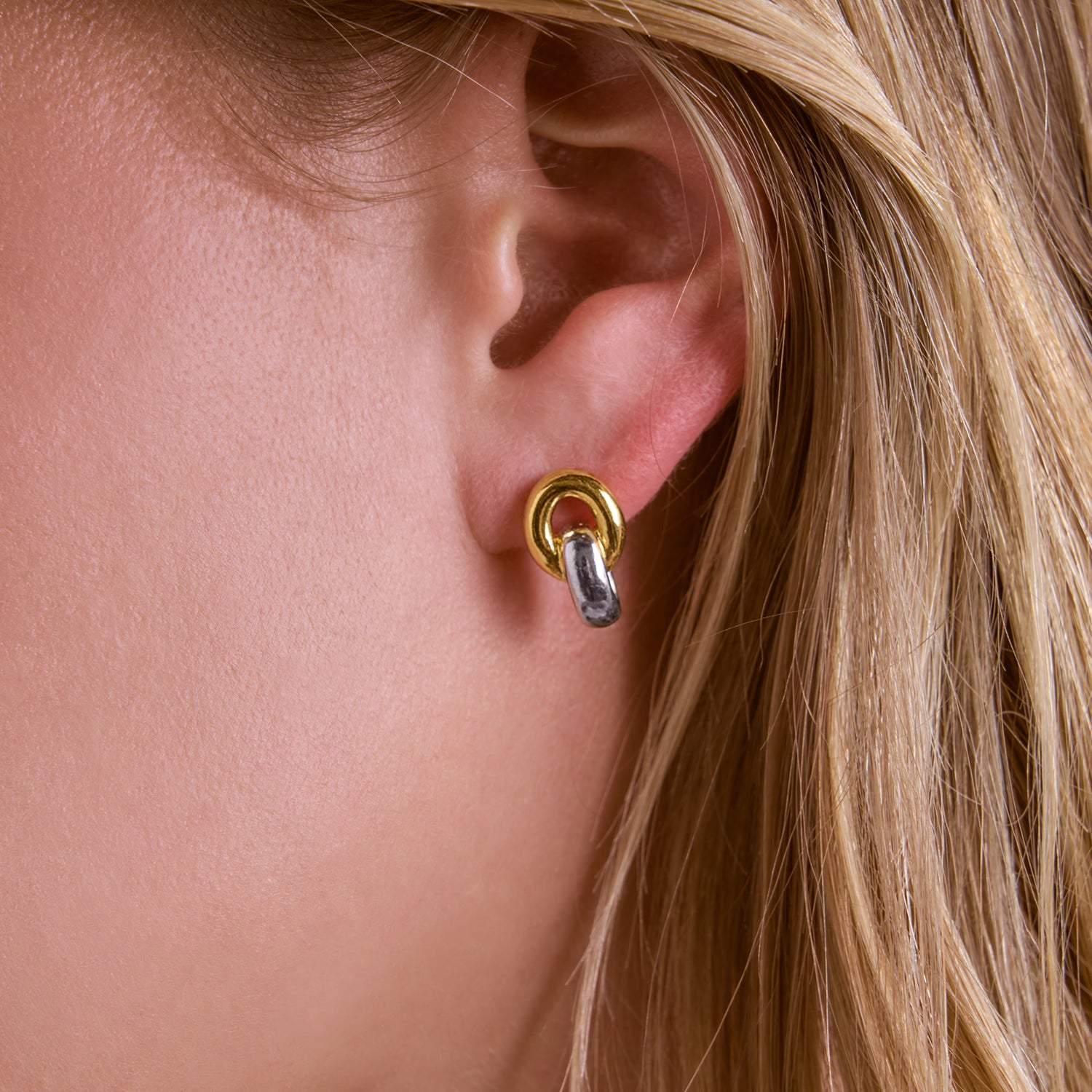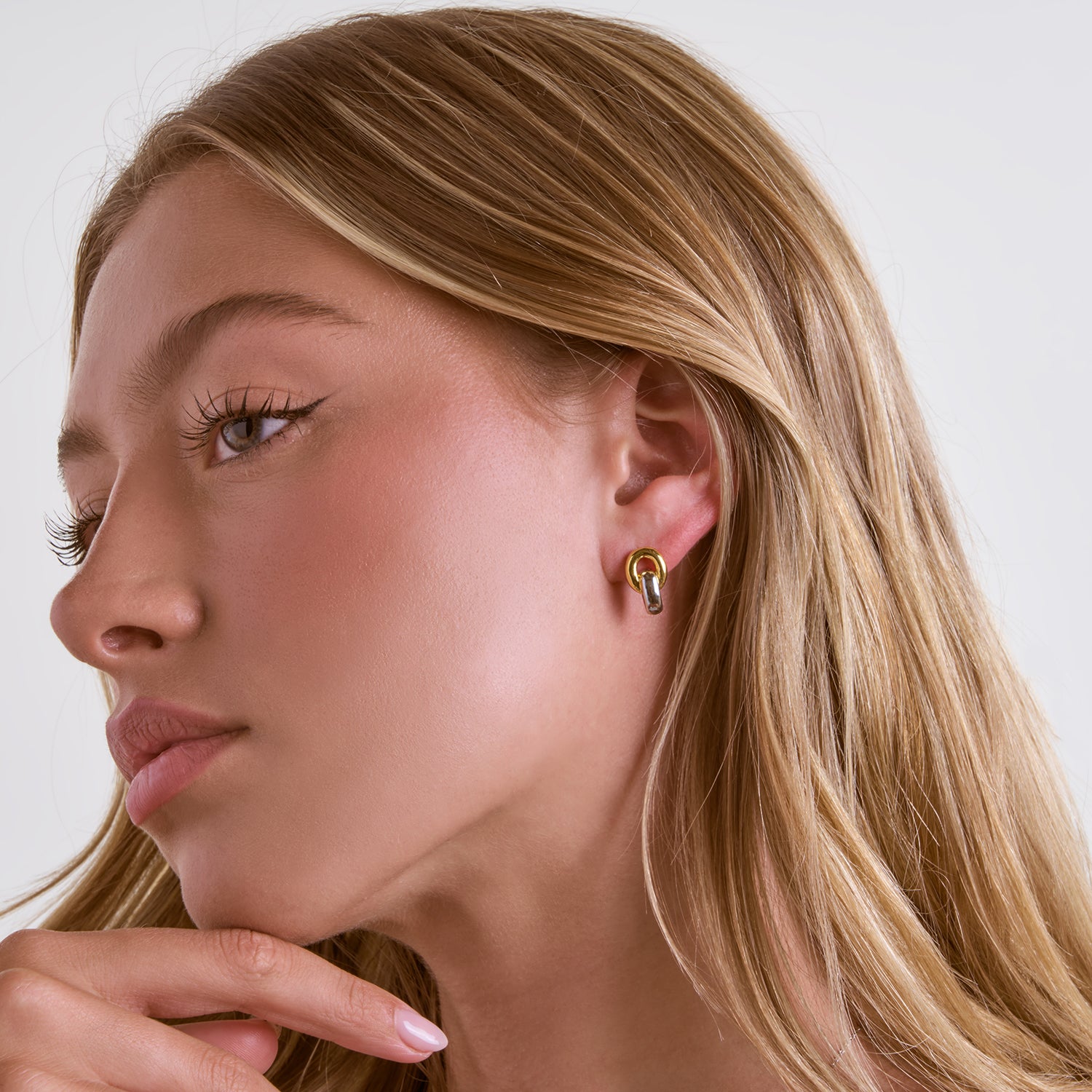 The Two-Toned Hoop Studs blend contemporary style with timeless elegance, featuring a sleek gold-dipped two-tone design that adds depth and dimension. Subtly intricate yet bold, these drop earrings bring a modern edge to any ensemble. Crafted with gold plating & rhodium plating over brass.
