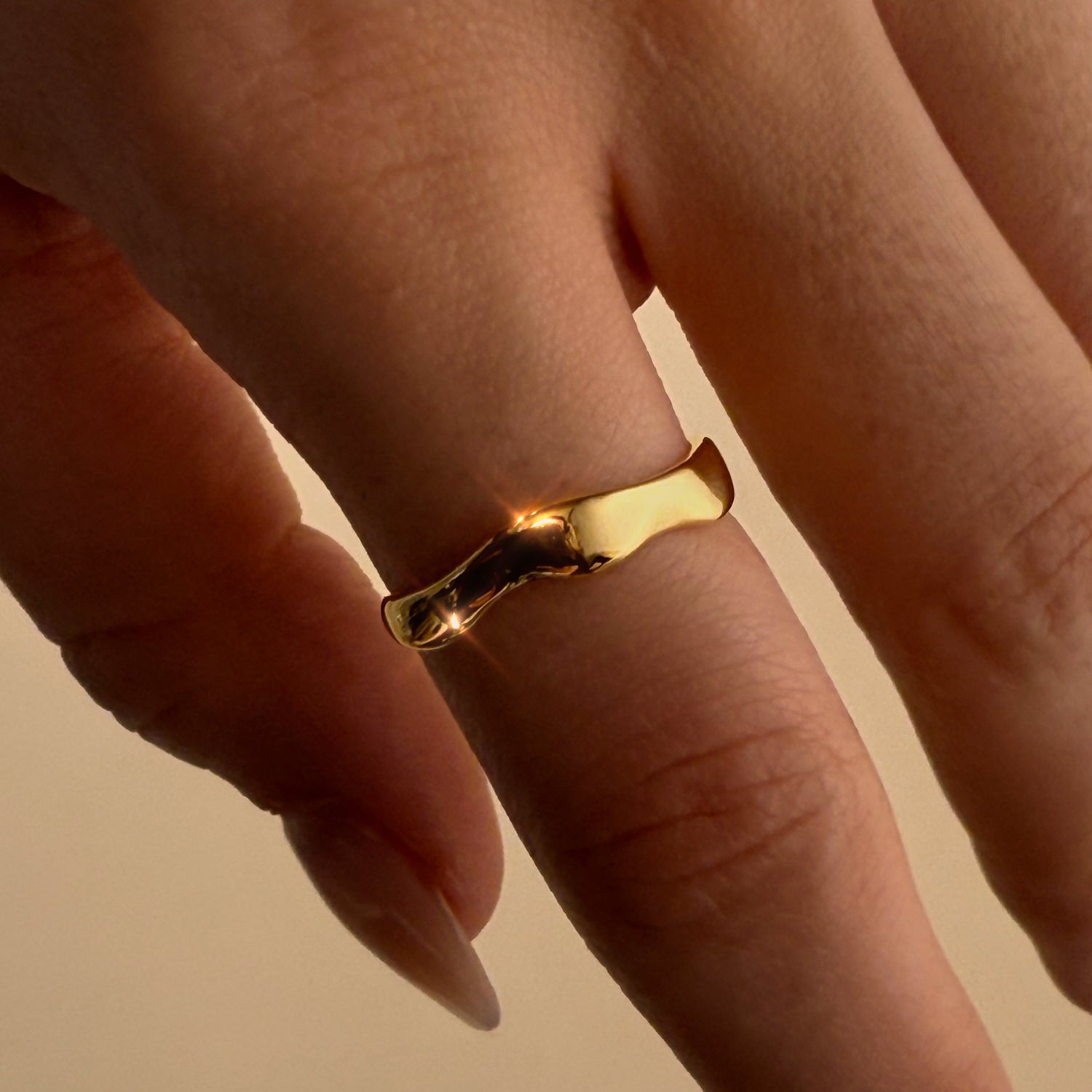 Adds sophistication to every look. The Wavy Metallic Ring features a refined gold-plated band with a smooth, warped design, effortlessly complementing any outfit. A stylish, versatile piece that enhances your everyday style. Crafted with gold plating over brass.