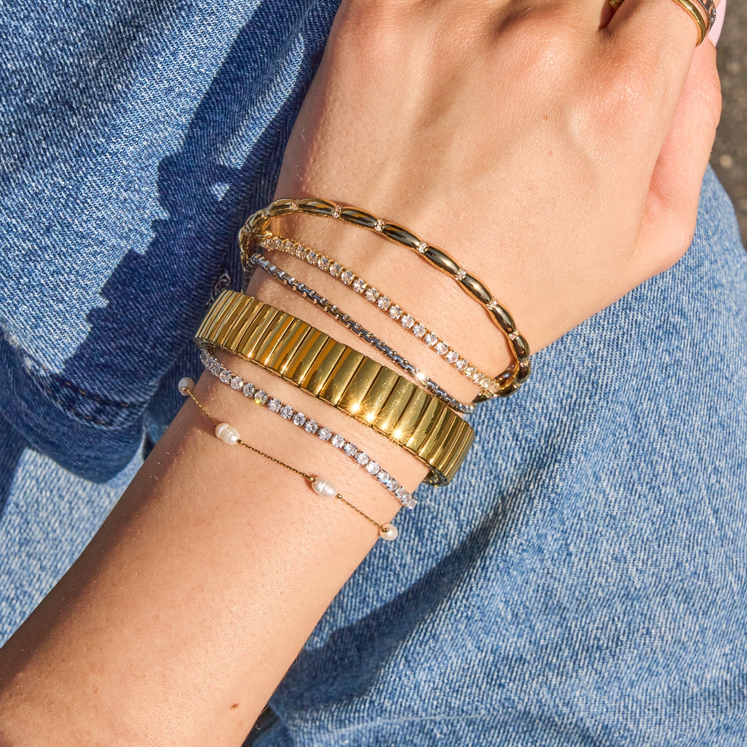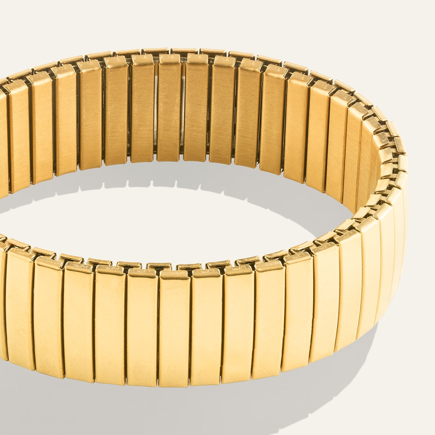 Bold lines meet flexible design in the Grid Bracelet. Featuring wide metallic rectangular bars on an elastic stretch fit, this piece adds structure without stiffness. Its clean geometry brings a modern edge to your stack, while the slip-on style keeps it effortlessly wearable. A subtle statement for everyday minimalism. Crafted with Gold plating over stainless steel.