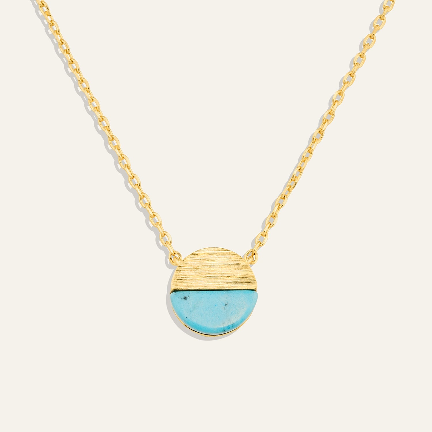 Discover understated elegance with the Half Stone Pendant Circle Necklace. This delicate piece features a smooth circle accented by a shimmering half-stone detail, adding a touch of sparkle without overpowering your look. Perfect for layering or wearing solo, it's a timeless accessory that brings subtle sophistication to any outfit. Crafted with gold plating over brass and a gemstone.