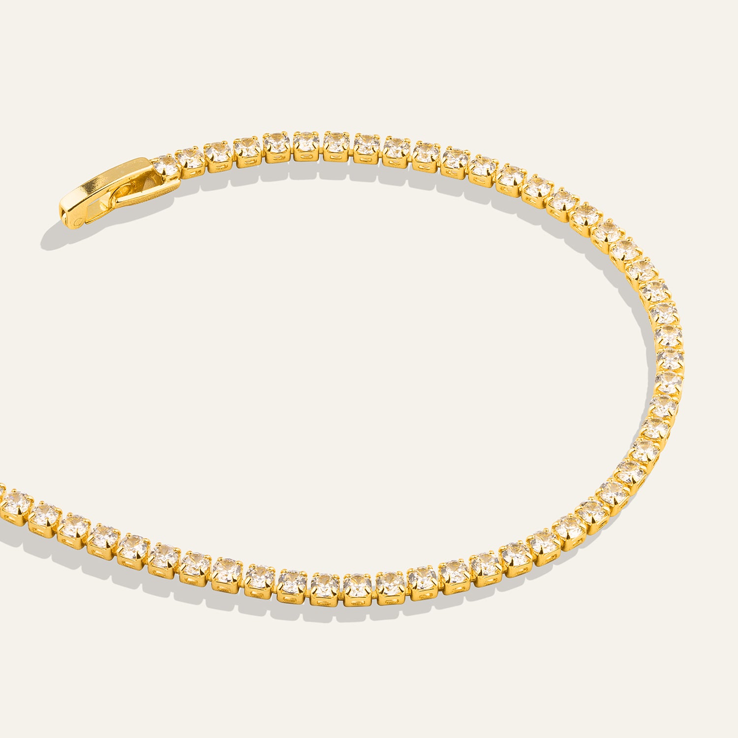 The Lucky Tennis Bracelet is a modern twist on an iconic style. Crafted with a delicate silhouette and finished with a distinctive rhinestone chain clasp, it brings just the right amount of sparkle to your everyday look. Light-catching and refined, this bracelet is designed to feel effortless while still making a statement. Wear it solo for a minimal moment or stack it with your favorites to create your own luck. Crafted with rhodium plating over brass & 18k gold plating over brass.