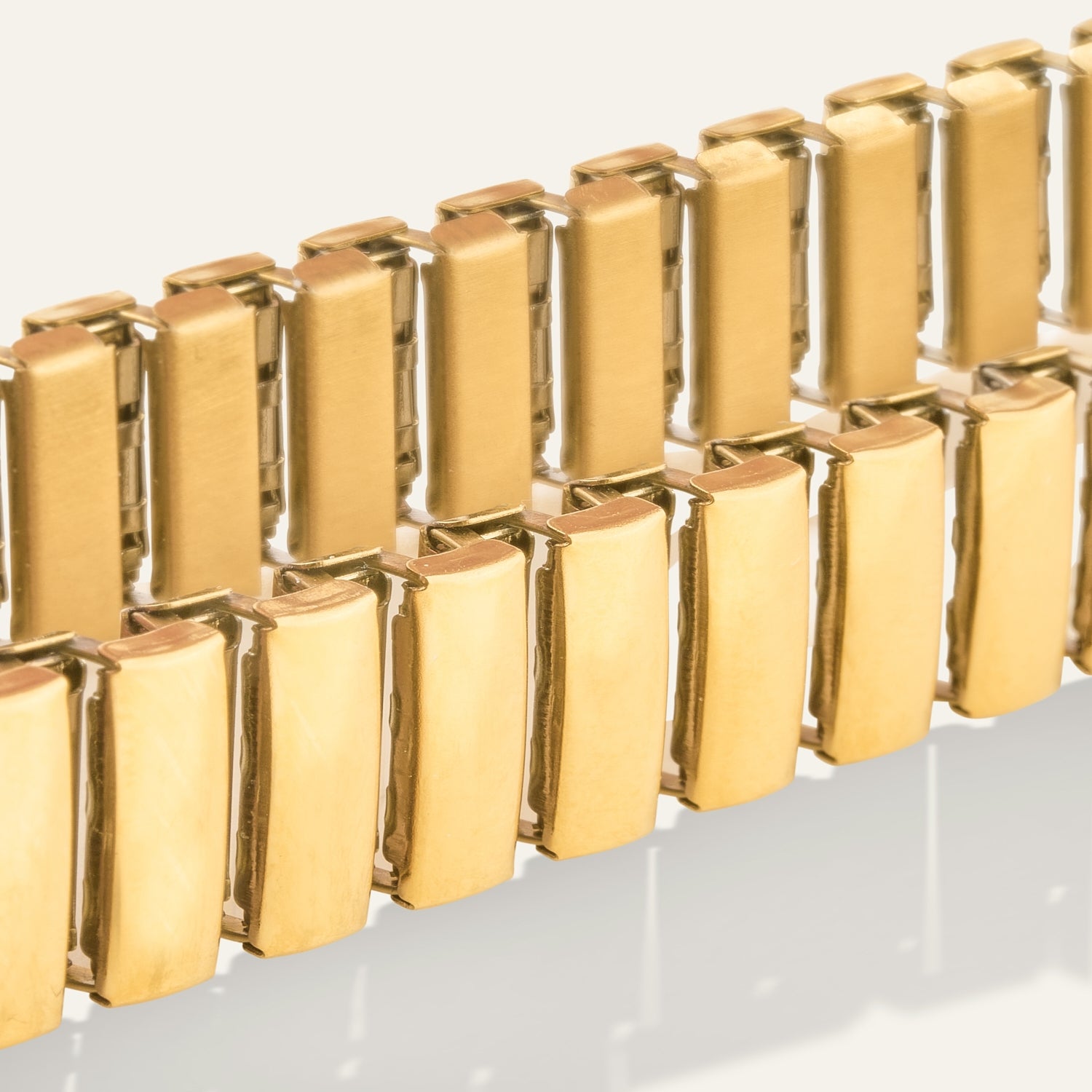 This bracelet features a modern design with sleek rectangular bars and a comfortable elastic fit, all crafted from gold dipping over polished stainless steel. Redefine your look effortlessly with this standout, on-trend piece that brings bold structure and everyday versatility to your stack.