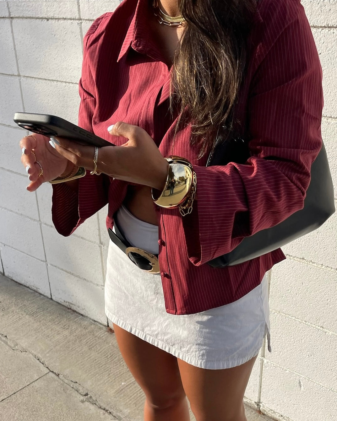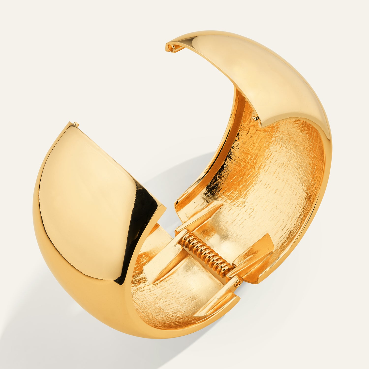 The Sculptural Hinge Bracelet showcases a sleek, wide rounded design with a minimalist hinge closure, offering effortless sophistication. This stylish piece brings a modern sculptural touch that elevates any look with ease. Crafted with gold dipping over alloy for a smooth, durable finish.