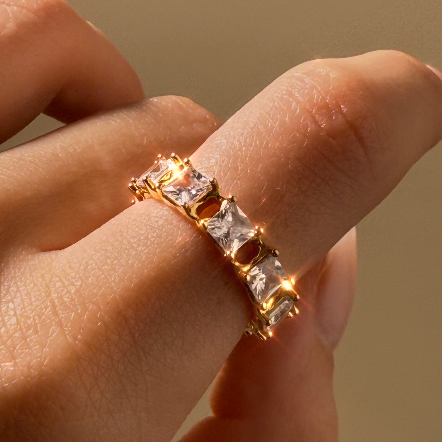 A statement of style and sophistication. The Square Stud Ring Set features metallic bands adorned with square rhinestone studs, bringing bold sparkle and fashion finesse to any look. A perfect accessory for elevating your everyday style. Crafted with gold plating over brass.