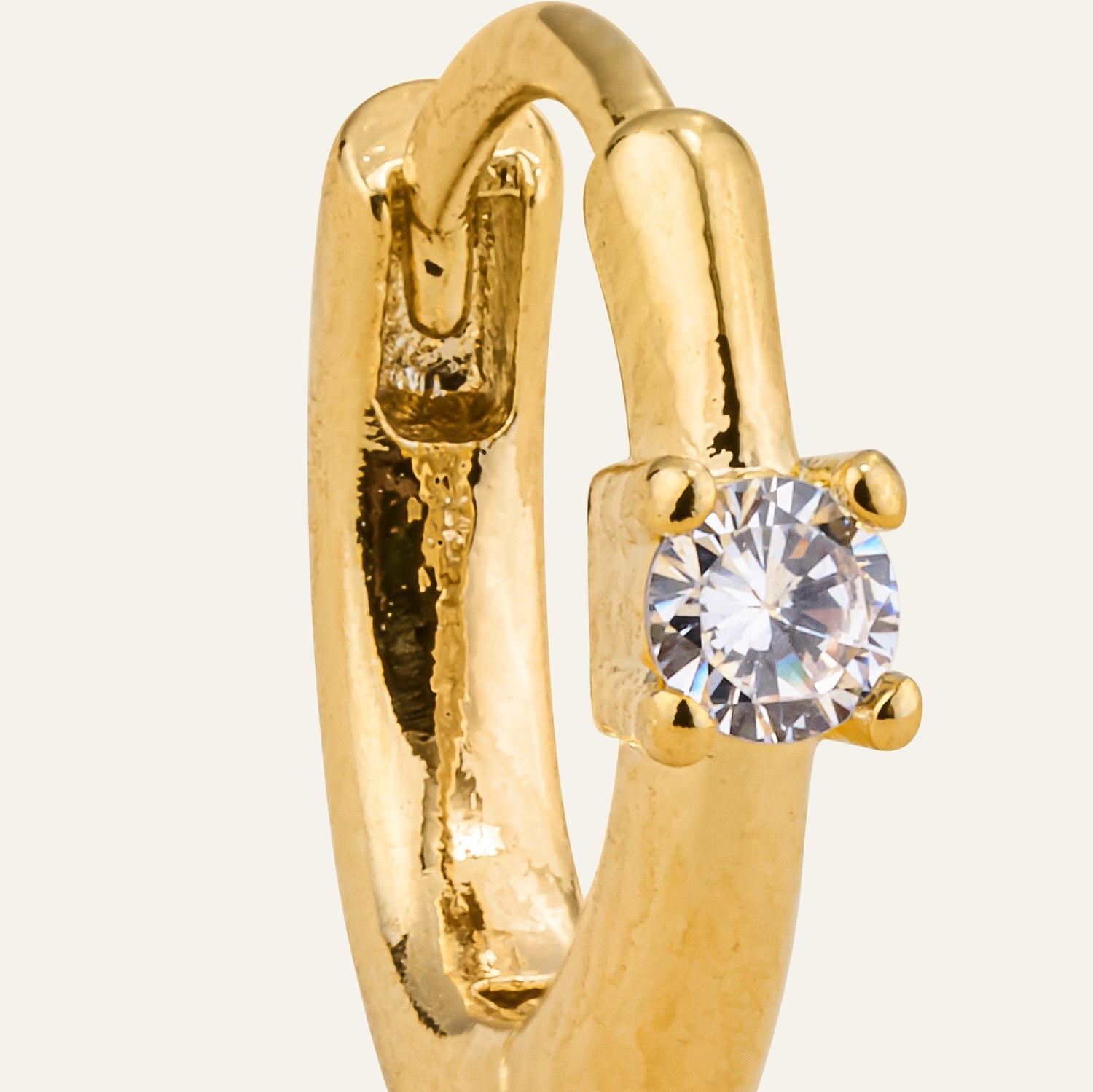 The Stud Huggie Hoop Earrings showcase a sleek hinge design accented with a single sparkling cubic zirconia stud, blending minimalism with a touch of brilliance. Perfect for everyday wear or layered styling, this on-trend piece redefines effortless elegance. Crafted with gold dipping over brass and set with radiant cubic zirconia.