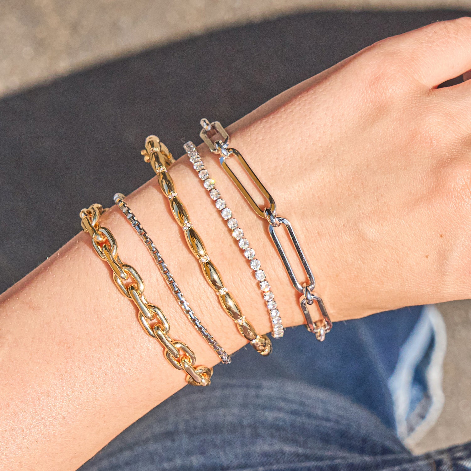 The Studded Hinge Bangle Bracelet shines with a vibrant gold-dipped finish and sparkling cubic zirconia accents, all set in a sleek rounded hinge design. Rich in detail and style, this piece is a standout accessory that adds glamour to your personal style. Crafted with gold-dipped brass and cubic zirconia jewels for a luxe, lasting finish