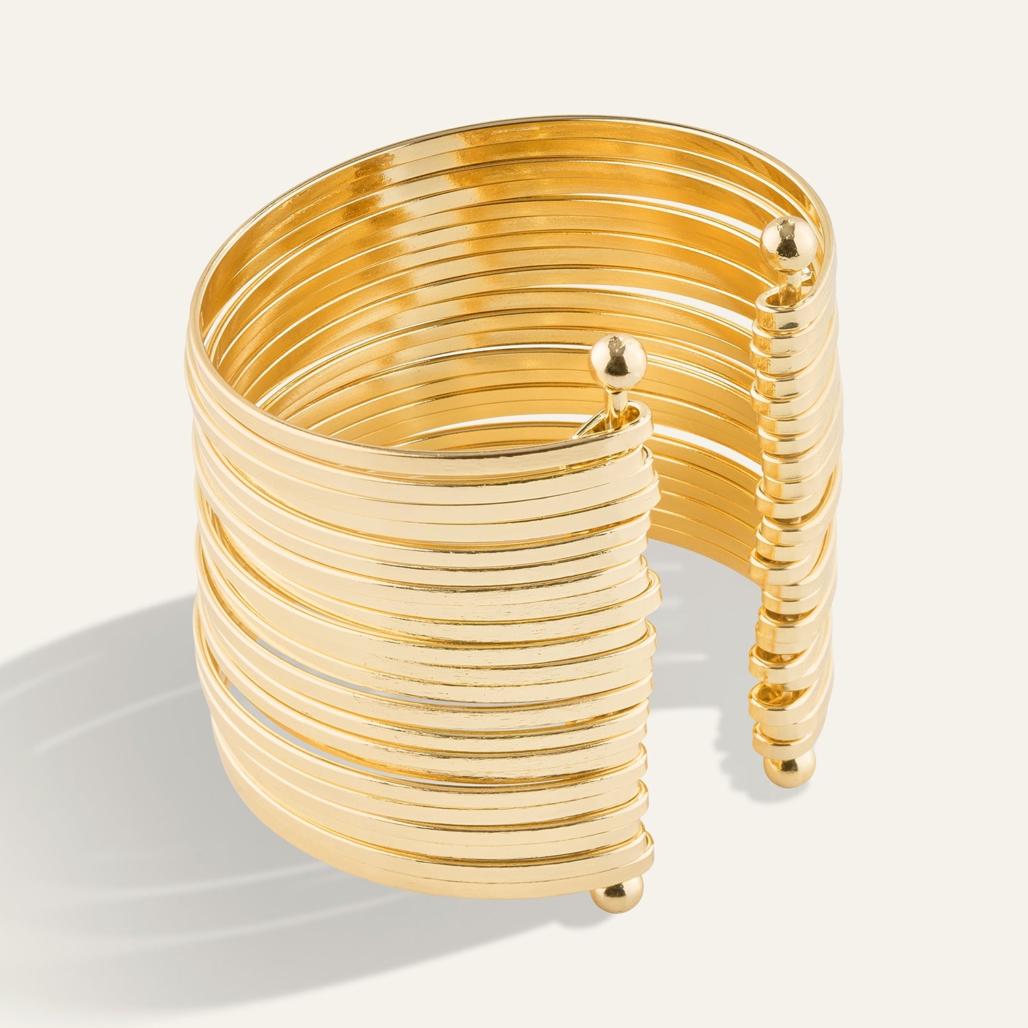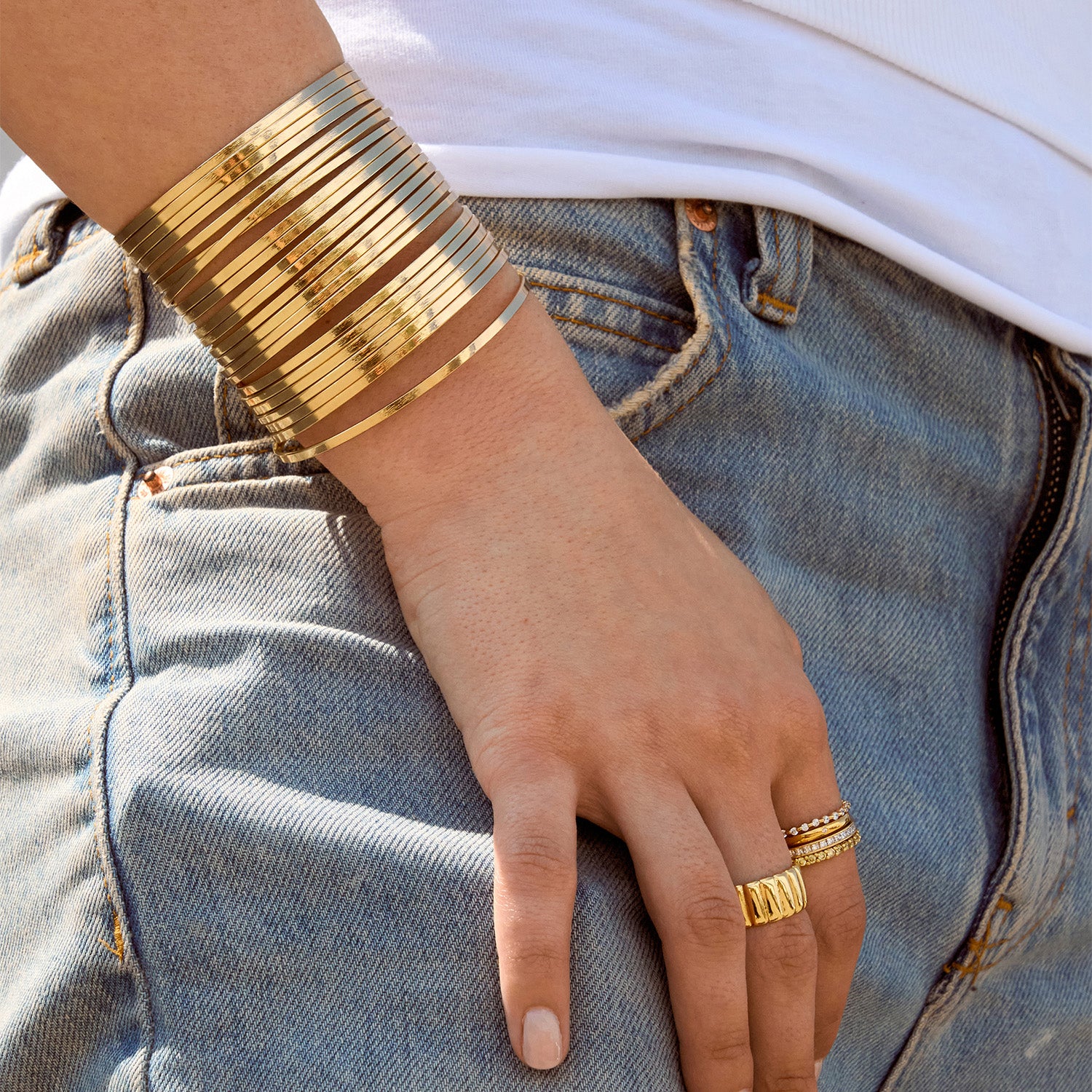 Sleek and sculptural, the Tut Cuff features layered solid metallic strands that create a clean, stacked look. Designed with a slimmer fit, it's perfect for smaller wrists and brings a subtle edge to any outfit. Lightweight, minimal, and made to move with you. Crafted with 18k gold plating over brass.