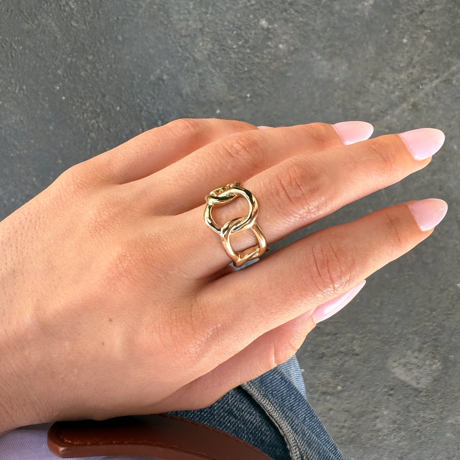Exquisitely crafted and designed to impress. The Chain Band Ring features a bold, wide band with a sleek solid chain design, making it the perfect statement piece for any look. Elegant yet edgy — ideal for elevating your everyday style. Crafted with gold plating over zinc.